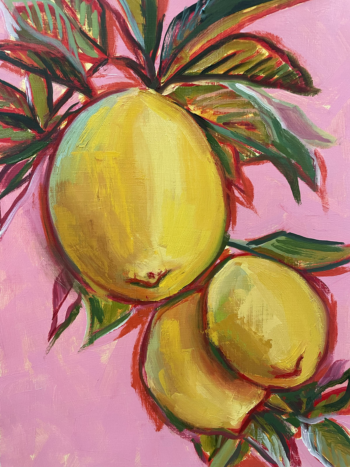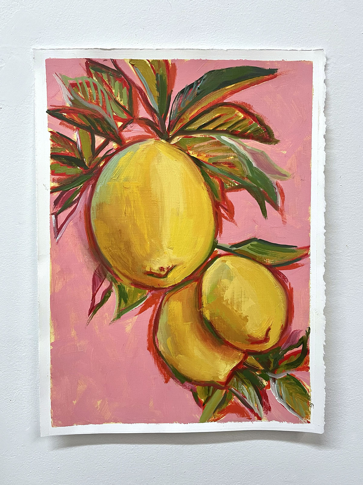 An original Mediterranean lemon oil painting on gesso’d 11″ x 15″ stonehenge paper. Signed by the artist.